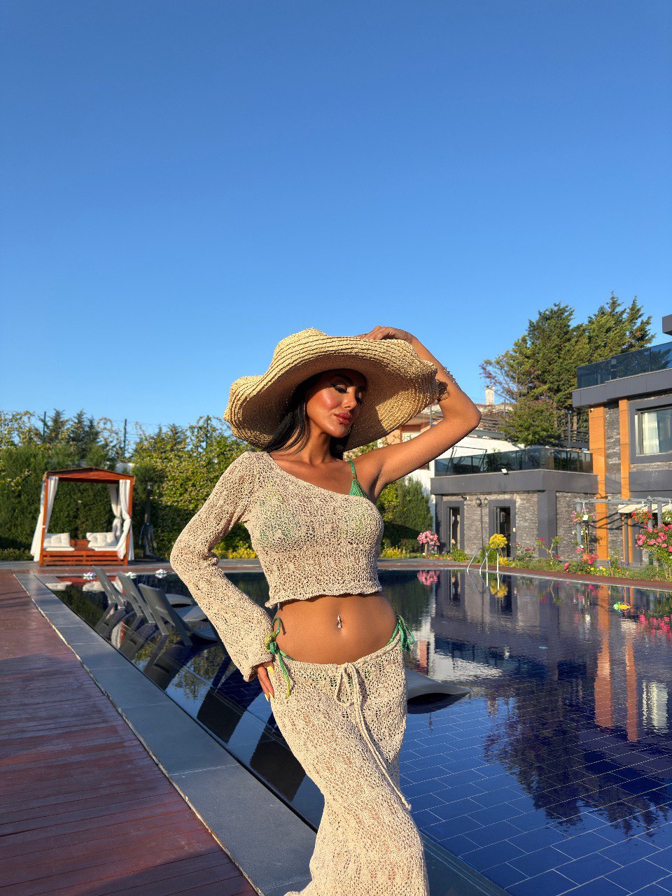This playful 2-piece beach cover-up in cream and beige is your perfect companion for sunny beach days and lively beach parties. Made from soft 100% acrylic knit, it offers a cozy yet breathable layer that’s easy to mix and match. Embrace the sun in style and comfort with this fun, versatile set.