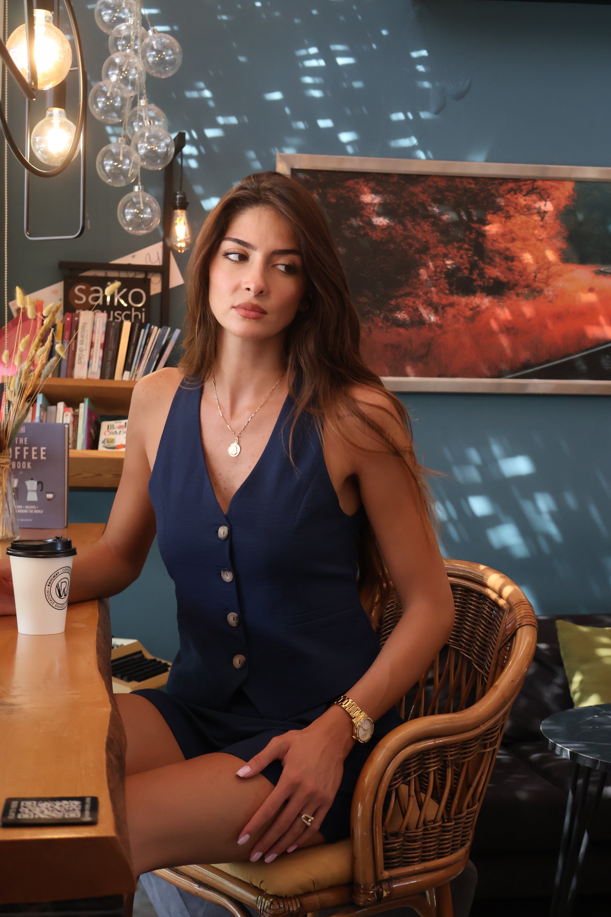 Step out in style with this playful Co-Ord Set featuring an open-back waistcoat. Crafted from 100% acrylic, it offers comfort and a sleek look in classic white or dark blue. Perfect for lunch dates, dinners, or parties, this set adds a catchy twist to your wardrobe.