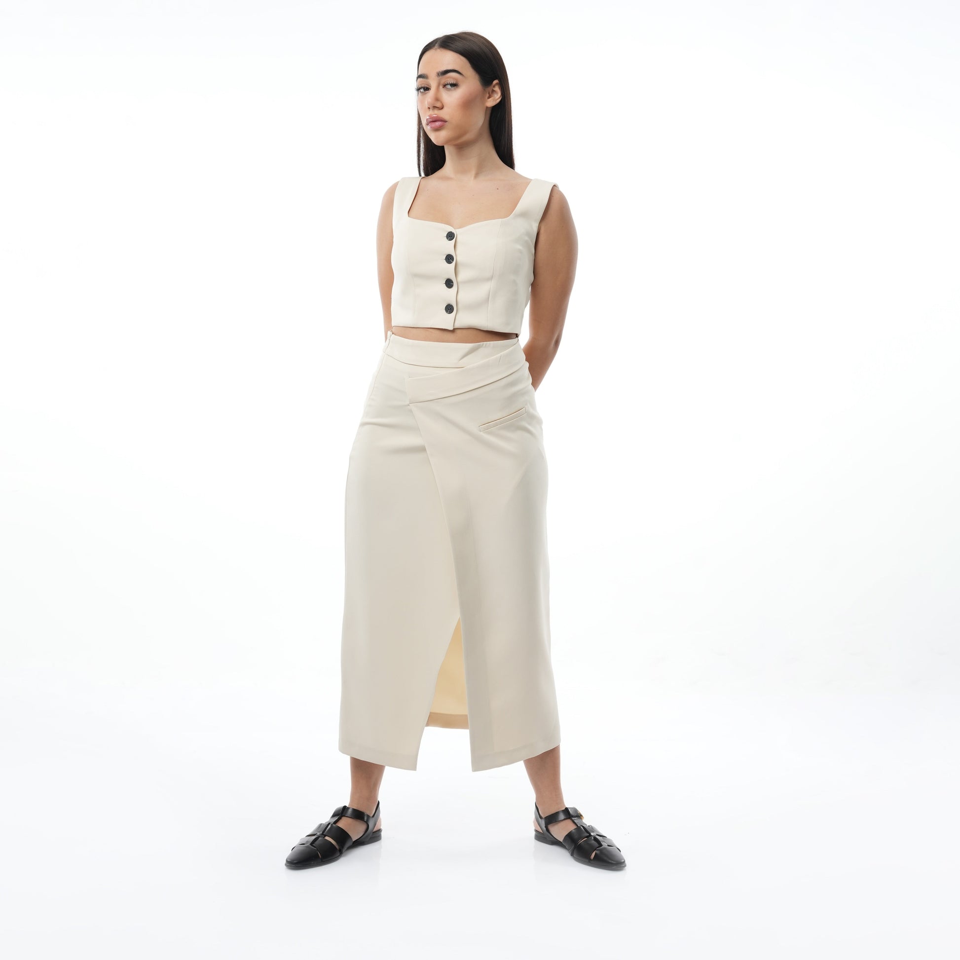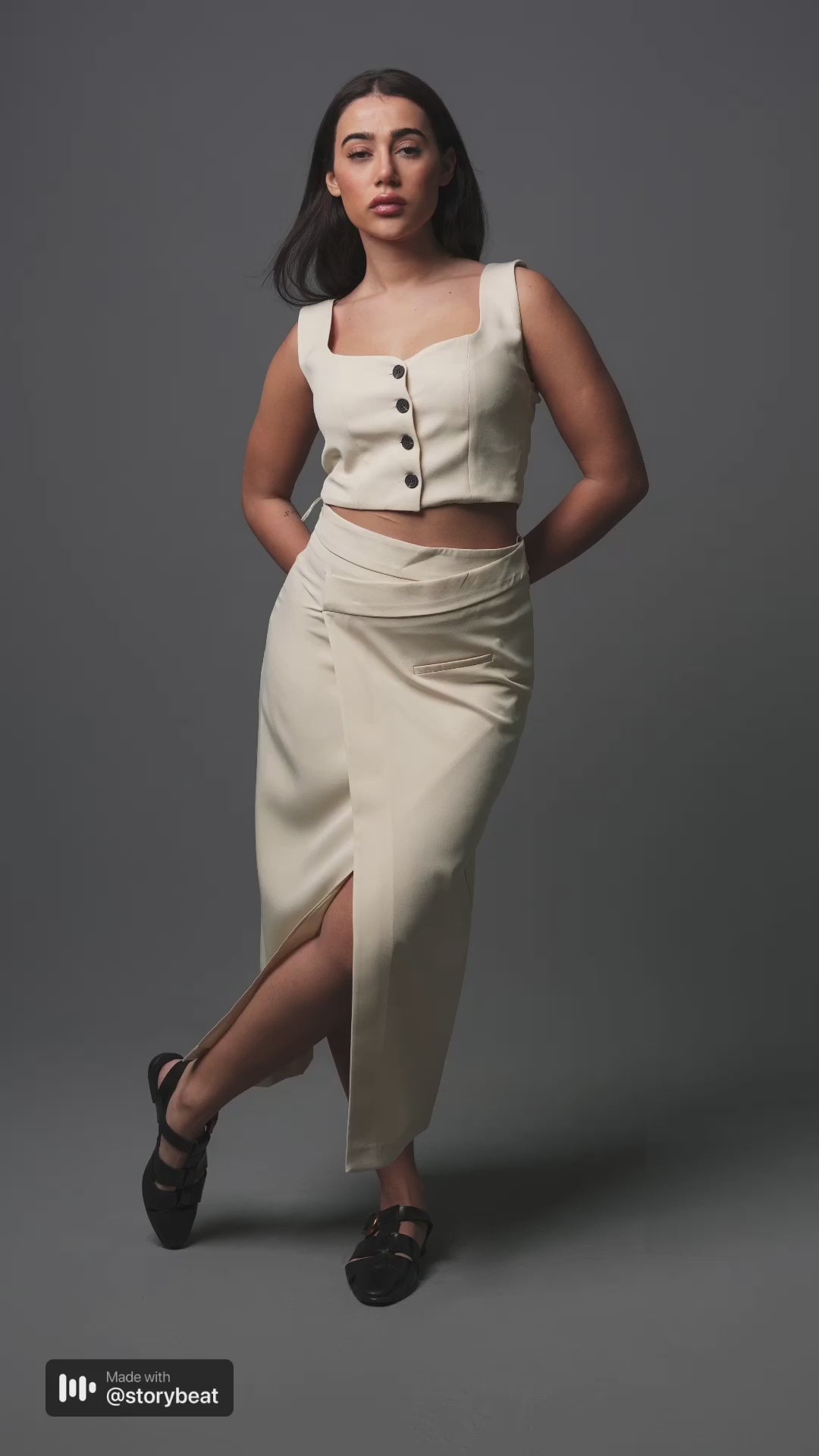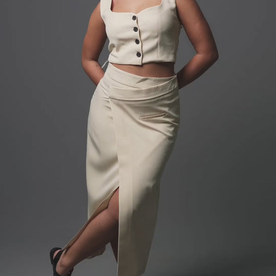 Elevate your style with our Co-Ord Set! This elegant and classic duo features a midi skirt with a stylish slit and a cropped waistcoat with a sweetheart neckline. The perfect combination of minimalistic and chic, all crafted with excellent materials. Make a statement wherever you go!
