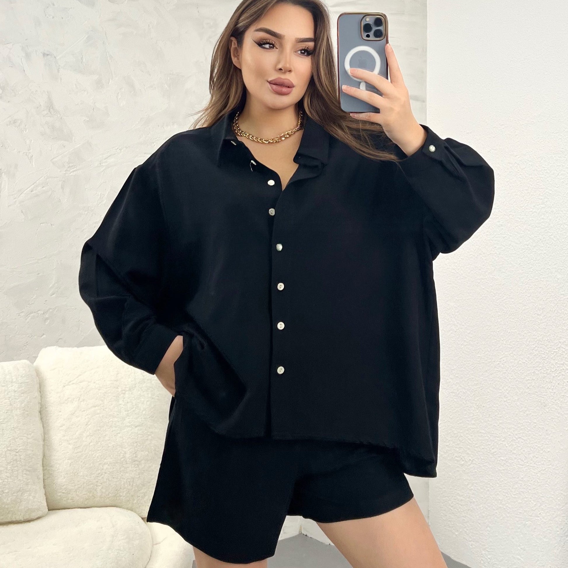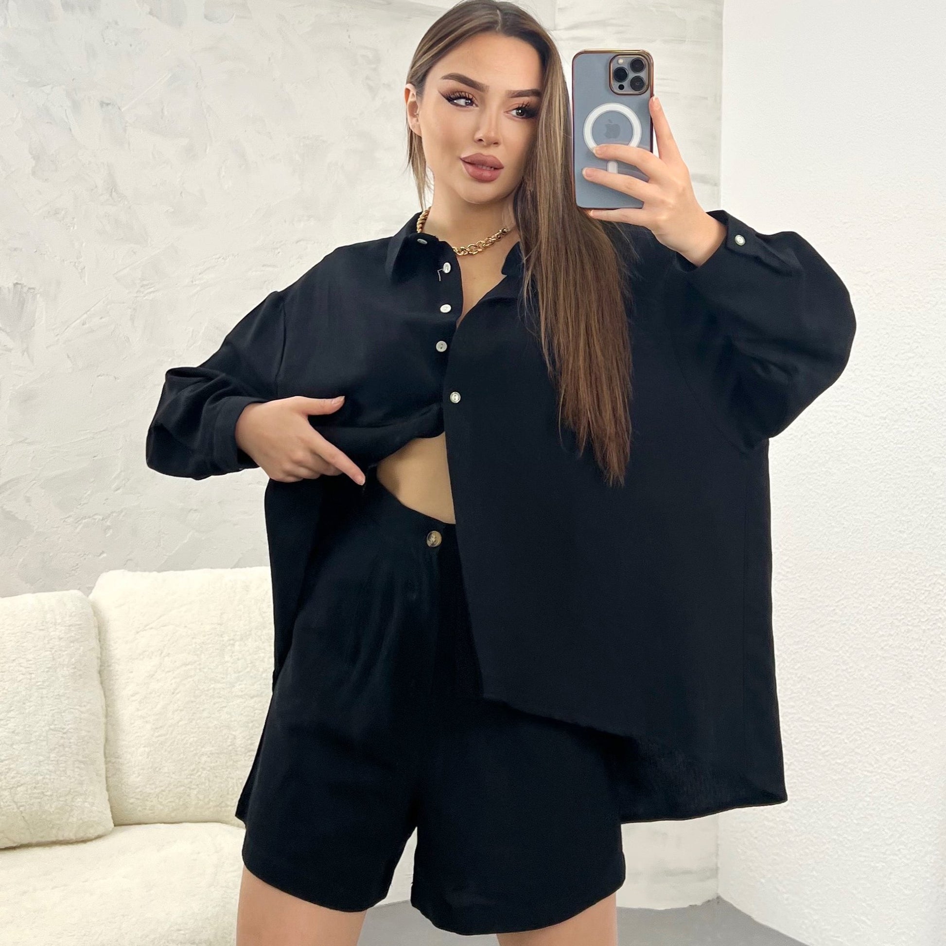 Indulge in ultimate luxury with our Co-Ord short set. This high-end and comfortable ensemble features a buttoned shirt and short made of a premium blend of 50% linen and 50% cotton, in a sleek ink black hue. Perfect for spring, this set will elevate your mood and style effortlessly.
